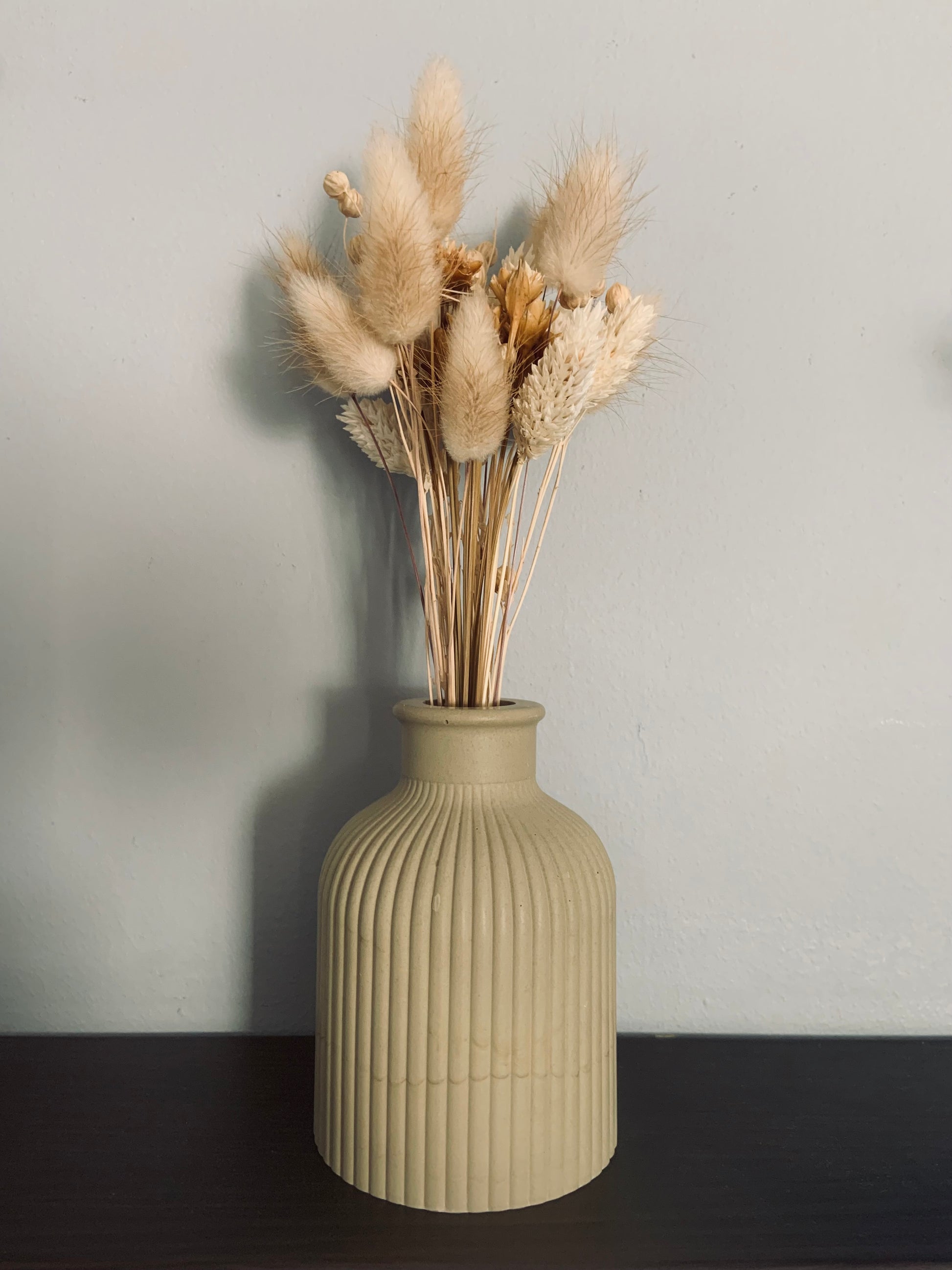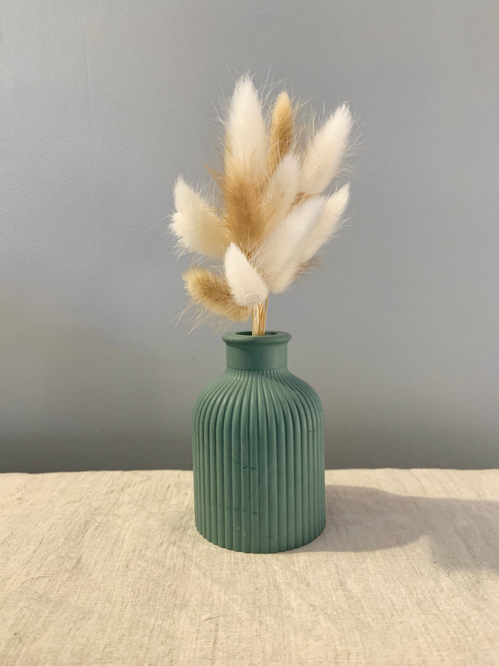 Un mini vase strié qui saura parfaitement mettre en valeur un joli bouquet de fleurs séchées.
